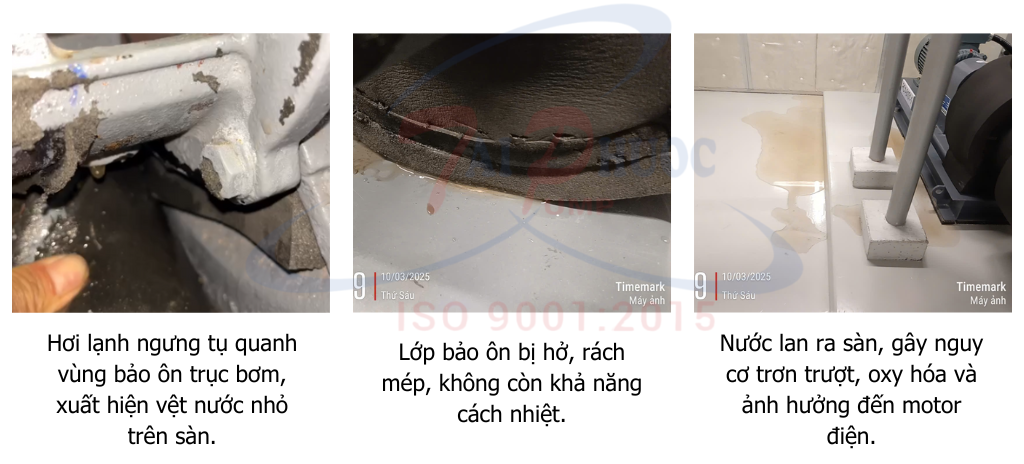 Lớp bảo ôn quanh trục bơm hở – hơi lạnh thoát ra gặp không khí ẩm tạo ngưng tụ.