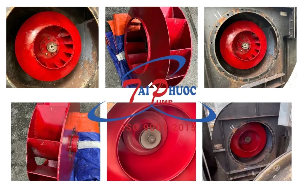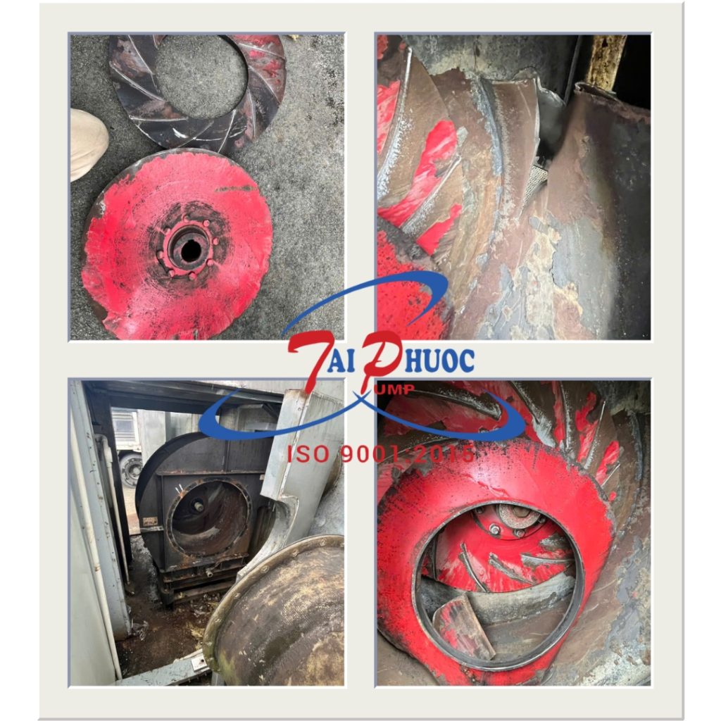 Guồng/cánh quạt cũ nứt vỡ tại moay-ơ, rụp mép cánh, nhiều cánh biến dạng – sứt gãy, dấu hiệu cọ xát với vỏ buồng quạt; lớp phủ chống gỉ xuống cấp nặng.
